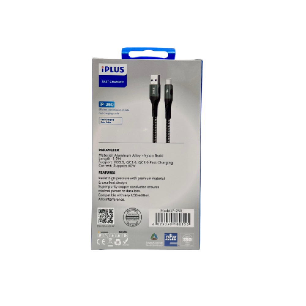 اختبر قوة الشحن الذكي مع كيبل iPLUS IP-250 بقدرة 60 واط ودعم تقنيات QC3.0 وQC2.0 لشحن أجهزتك بأمان وسرعة دون سخونة أو فقد في الطاقة. حيث يتميز بتصميم متين من النايلون المضفر المقاوم للتآكل مع موصلات سبائك ألمنيوم تمنحه مظهرًا عصريًا وعمرًا أطول. كما يوفّر نقل بيانات بسرعة 480Mbps لتجربة استخدام متكاملة تجمع بين الأداء والكفاءة. سواءً في المنزل أو أثناء السفر، كما يمنحك كيبل iPLUS الثقة في كل عملية شحن مع ضمان لمدة سنتين من متجر رهيب لجودة تدوم طويلاً.